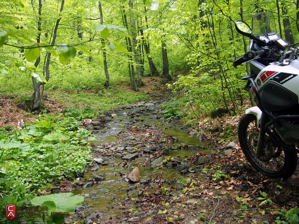 Mentünk tovább rendületlenül, minden út vezet valahová, ezt a jelszót ismételgettem Tibinek. Ő ebben már nem volt annyira biztos. Sem nekem, sem neki nem lett igaza, egy patakátkelés előtt meg kellett, hogy álljunk. Az egyik irány, amerre folytatódott a nyomvonal iszonyatosan meredek volt, nem is értem, miért nem szereltek felvonót mellé. Az eső miatt még gyalogosan is kihívás lett volna feljutni a mély sárban. A másik irány a patakmederben, és amellett vezetett, ezt választottuk. De látszott, hogy küzdelmes lesz, sok helyen csak a motorokat tolva tudunk haladni. Nem volt járható az út, de makacsul tovább akartam menni, mivel nem messze a GPS-em már utat jelölt. De a köves ösvény nemsokára véget ért, csak a patakban tudtunk volna folyásiránnyal szemben haladni… gyalog talán. Szóval visszafordultunk. Én nagyon el voltam kámpicsorodva, Tibi egy kicsit fellélegzett. Aztán eszébe jutott, hogy valahol talán eltértünk a helyes iránytól. Találtunk is egy elágazást, gondoltuk megpróbáljuk másfelé. A GPS-ekkel csak légvonalban tudtunk navigálni, aminek meg pont semmi értelme nem volt, az út ment valamilyen irányba, mi pedig követtük. A patakbeli gimnasztika kivette az erőnket, és majd egy fél napunkba került.