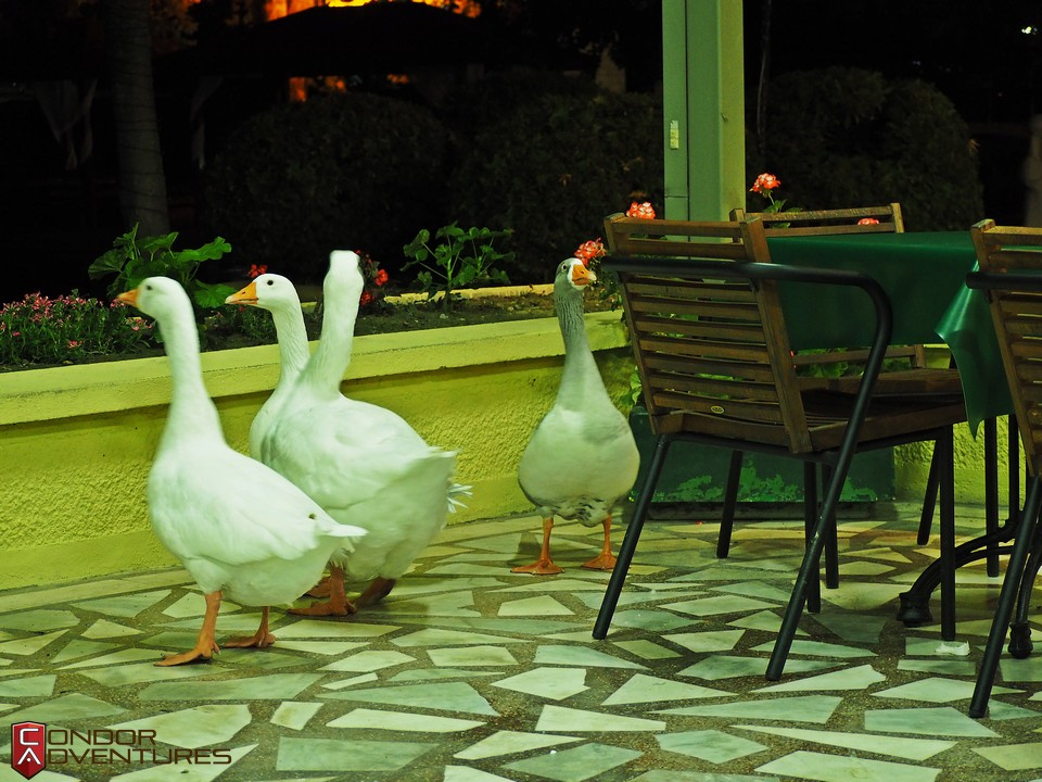 Aztán beültem az étterem teraszára, ahol épp buli volt. Menyasszonyt és vőlegényt nem láttam, nem is tudom mit ünnepelhettek, talán valami halláskárosult buli lehetett éppen. Az asztalok roskadoztak a maradékoktól, én csak ültem rendületlenül az eszméletlenül hangos zenebonában nyálcsorgatva, mire végre odatévedt egy pincérforma. Nyelvi akadályok nem nehezítették a kommunikációt, mivel csak a mutogatásnak volt értelme az üvöltő zene mellett. Elmutogatta, hogy ő nem tud kiszolgálni, de küld valakit. Újabb fél óra múlva feladtam a várakozást, és korgó gyomorral kibattyogtam az útra, ahol egy benzinkút fényeit fedeztem fel. Sajnos csak az éjszakai világítás volt, a kút zárva, lemondhattam az esetleg beszerezhető csokiról is. A giccses kerti tóban láttam libákat, de az túl vad ötletnek tűnt, hogy elkapok egyet és megsütöm, mivel pont a buliterasz mellett volt. Mérgelődve megittam egy liter vizet vacsora helyett, aztán lefeküdtünk aludni. Brigi persze evett, ő elégedetten durmolta végig az éjszakát. A dajdaj természetesen ment egész éjszaka.